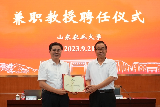 大会期间,山东农业大学兼职教授聘任仪式同时举行,高旺盛教授受聘为我校兼职教授,并为我校师生做题为《建设中国特色农业强国理论框架与战略路径》的报告,冷畅俭出席活动并为其颁发聘书,王勇主持活动。