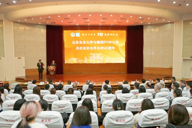 10月25日上午,山东农业大学与FOM大学共庆友好合作办学二十周年暨山东农业大学德国校友组织筹备委员会成立会议在文理大楼报告厅举行。学校党委副书记、校长冷畅俭,FOM大学行政校长白潇乐出席庆典活动并致辞,副校长林海主持活动。