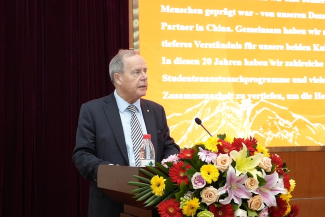 白潇乐对中德友好合作办学20周年表示祝贺,肯定校友们在两国之间架起的友谊桥梁。他说,过去二十年里,山东农业大学与FOM大学在联合研究项目、文化活动、学生交流项目等方面取得了许多里程碑式的成就,希望中德双方继续深化合作,筑牢中德文化和教育之间的桥梁,成为国际教育和文化交流的典范。