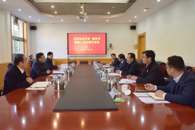 刘运介绍了潍坊市经济社会发展情况并重点介绍了现代农业发展的优势。他说,山东农业大学办学历史悠久,综合实力雄厚,与潍坊市交往密集、互动频繁,有着良好的合作基础。近年来,潍坊市委、市政府深入学习贯彻习近平总书记关于“三农”工作的重要论述,认真贯彻落实省委、省政府部署安排,持续在拓展创新“诸城模式、潍坊模式、寿光模式”上下功夫、求实效,推动农业生产要素在更大范围、更高层次进行优化配置,实现了农业组织模式、农业生产模式和农村社会治理模式的深刻变革,乡村振兴齐鲁样板先行区建设取得明显成效。当前,我们正聚力加快建设实力强品质优生活美的更好潍坊,真诚期待校地双方深化沟通互鉴、深挖合作空间,在科研人才引进、科技成果转化、推动产业发展等方面,不断拓展合作的深度和广度,携手续写校地合作新篇章,努力实现互利共赢新发展。