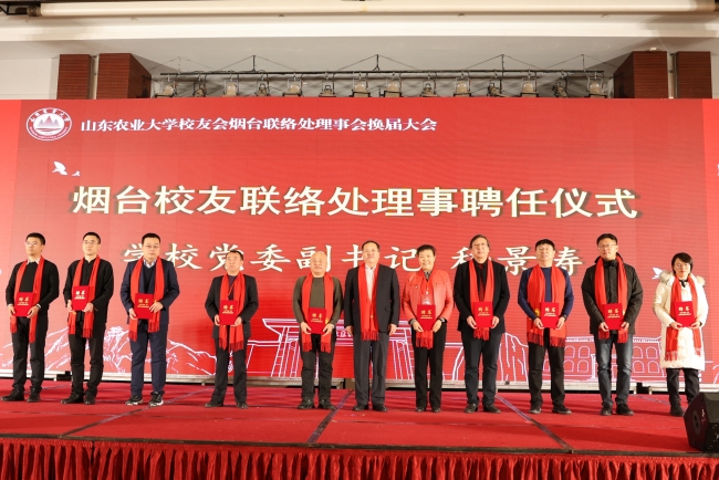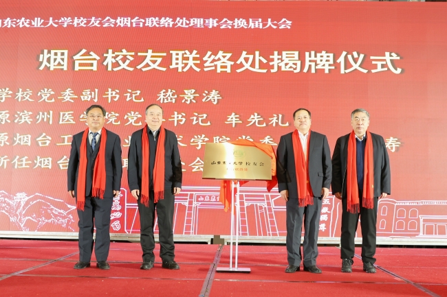 12月16日,山东农业大学校友会烟台联络处理事会换届大会暨校友论坛在烟台举行。山东农业大学党委副书记嵇景涛,滨州医学院党委原书记车先礼,烟台工程职业技术学院党委书记赵裕寿,杰出校友、山东益生种畜禽有限公司董事长曹积生出席会议,共同为山东农业大学校友会烟台联络处揭牌。山东农业大学校友会秘书长、教育发展基金会秘书长亓爱收主持论坛。